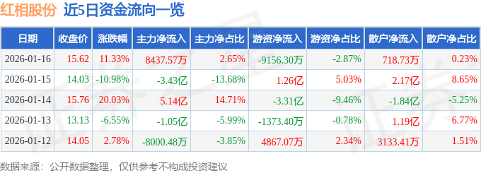 证券之星消息,截至2026年1月16日收盘,红相股份(300427)报收于15.62元,上涨11.33%,换手率40.36%,成交量203.01万手,成交额31.87亿元。