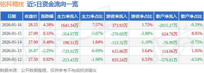 证券之星消息,截至2026年1月16日收盘,铭科精技(001319)报收于28.25元,上涨4.28%,换手率9.48%,成交量7.77万手,成交额2.17亿元。