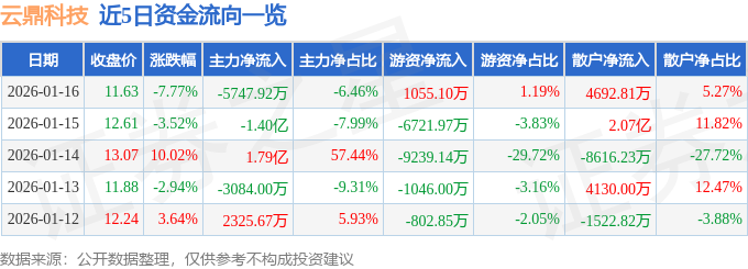证券之星消息,截至2026年1月16日收盘,云鼎科技(000409)报收于11.63元,下跌7.77%,换手率12.7%,成交量74.51万手,成交额8.9亿元。