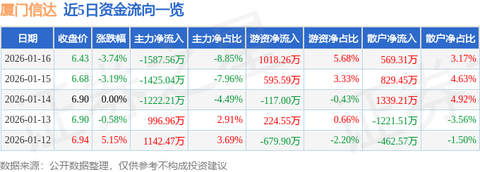 证券之星消息,截至2026年1月16日收盘,厦门信达(000701)报收于6.43元,下跌3.74%,换手率4.13%,成交量27.61万手,成交额1.79亿元。