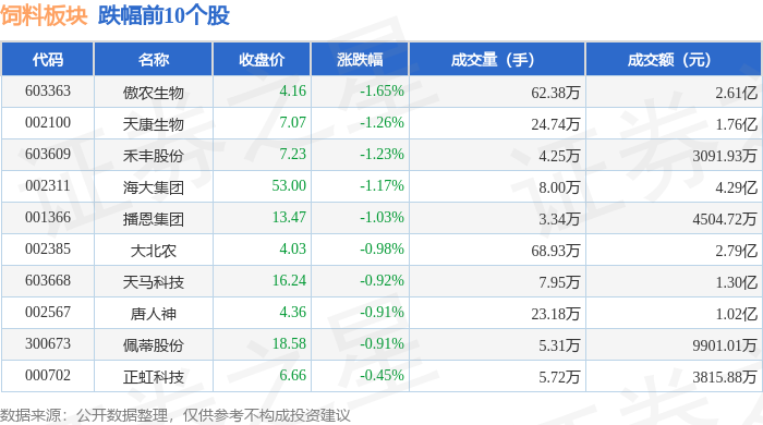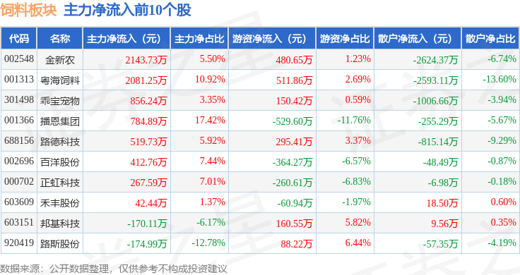 从资金流向上来看,当日饲料板块主力资金净流出7100.75万元,游资资金净流入3976.71万元,散户资金净流入3124.04万元。饲料板块个股资金流向见下表: