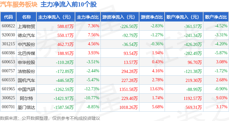 从资金流向上来看,当日汽车服务板块主力资金净流出1.69亿元,游资资金净流入8503.37万元,散户资金净流入8441.39万元。汽车服务板块个股资金流向见下表: