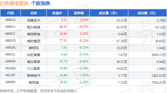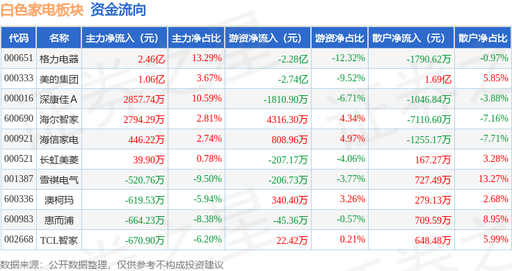 从资金流向上来看,当日白色家电板块主力资金净流入3.88亿元,游资资金净流出4.7亿元,散户资金净流入8202.16万元。白色家电板块个股资金流向见下表: