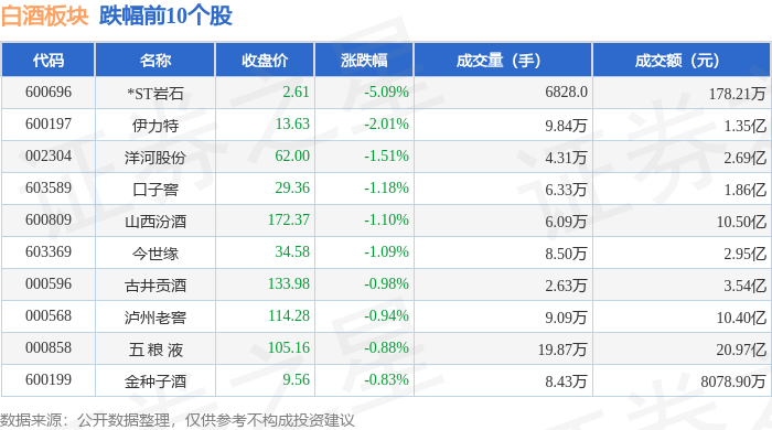 证券之星消息,1月16日白酒板块较上一交易日下跌0.66%,*ST岩石领跌。当日上证指数报收于4101.91,下跌0.26%。深证成指报收于14281.08,下跌0.18%。白酒板块个股涨跌见下表: