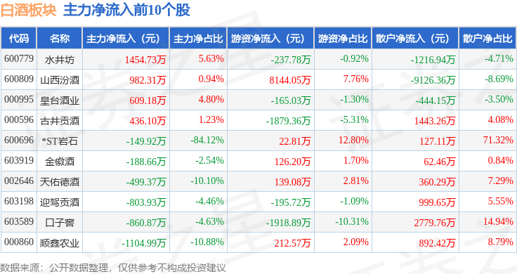 从资金流向上来看,当日白酒板块主力资金净流出8.33亿元,游资资金净流入4.55亿元,散户资金净流入3.78亿元。白酒板块个股资金流向见下表: