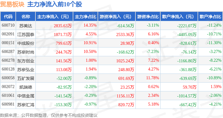 从资金流向上来看,当日贸易板块主力资金净流入668.61万元,游资资金净流入6210.46万元,散户资金净流出6879.08万元。贸易板块个股资金流向见下表: