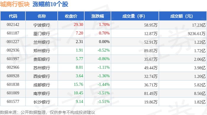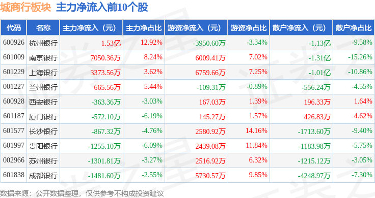 从资金流向上来看,当日城商行板块主力资金净流出2.29亿元,游资资金净流入7.16亿元,散户资金净流出4.87亿元。城商行板块个股资金流向见下表: