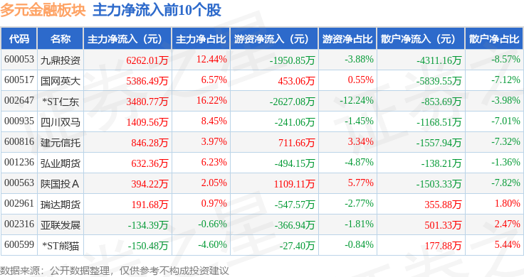 从资金流向上来看,当日多元金融板块主力资金净流出7.92亿元,游资资金净流入3.27亿元,散户资金净流入4.66亿元。多元金融板块个股资金流向见下表: