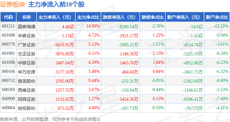 从资金流向上来看,当日证券板块主力资金净流出15.91亿元,游资资金净流入10.12亿元,散户资金净流入5.8亿元。证券板块个股资金流向见下表: