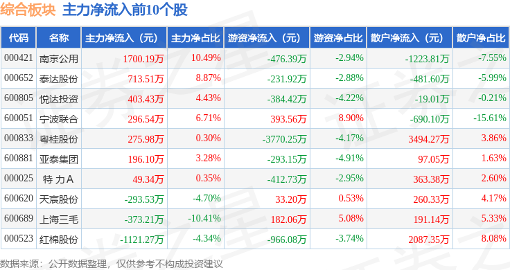从资金流向上来看,当日综合板块主力资金净流出5.6亿元,游资资金净流出2411.97万元,散户资金净流入5.84亿元。综合板块个股资金流向见下表: