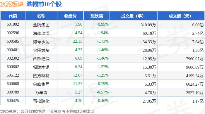 证券之星消息,1月16日水泥板块较上一交易日下跌0.92%,金隅集团领跌。当日上证指数报收于4101.91,下跌0.26%。深证成指报收于14281.08,下跌0.18%。水泥板块个股涨跌见下表: