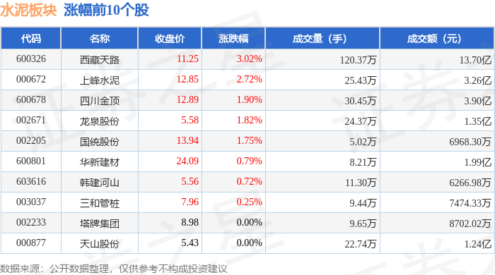 从资金流向上来看,当日水泥板块主力资金净流入1.26亿元,游资资金净流入3460.4万元,散户资金净流出1.61亿元。水泥板块个股资金流向见下表: