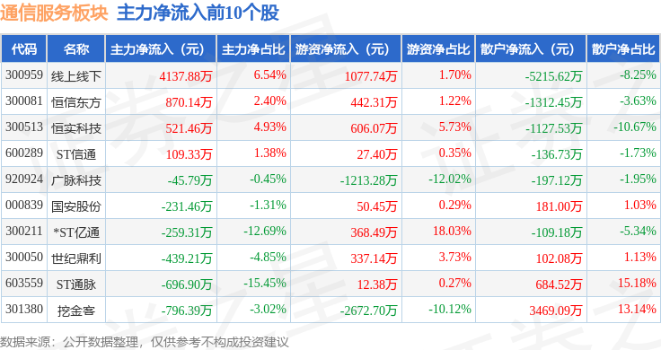 从资金流向上来看,当日通信服务板块主力资金净流出37.97亿元,游资资金净流入9.55亿元,散户资金净流入28.42亿元。通信服务板块个股资金流向见下表: