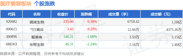 证券之星消息,1月16日医疗美容板块较上一交易日下跌1.79%,华熙生物领跌。当日上证指数报收于4101.91,下跌0.26%。深证成指报收于14281.08,下跌0.18%。医疗美容板块个股涨跌见下表: