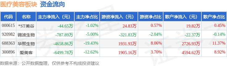 从资金流向上来看,当日医疗美容板块主力资金净流出1.12亿元,游资资金净流入3861.91万元,散户资金净流入7341.38万元。医疗美容板块个股资金流向见下表: