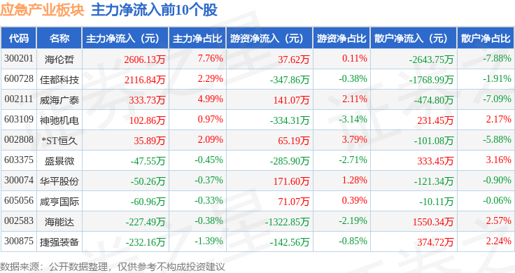 从资金流向上来看,当日应急产业板块主力资金净流出24.98亿元,游资资金净流入7.86亿元,散户资金净流入17.12亿元。应急产业板块个股资金流向见下表:
