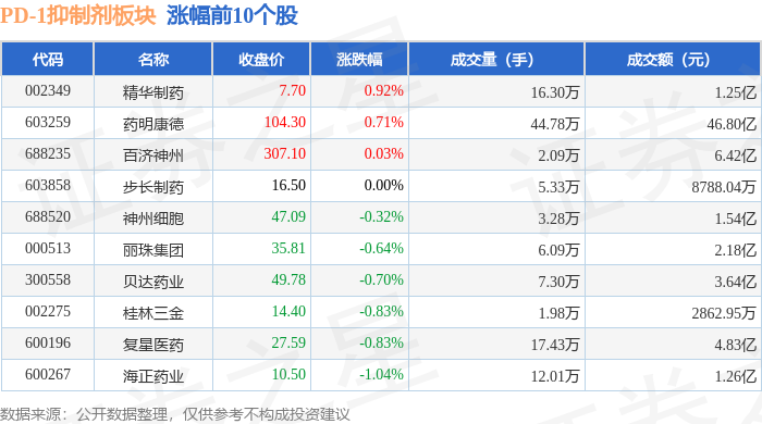 证券之星消息,1月16日PD-1抑制剂板块较上一交易日下跌0.93%,誉衡药业领跌。当日上证指数报收于4101.91,下跌0.26%。深证成指报收于14281.08,下跌0.18%。PD-1抑制剂板块个股涨跌见下表: