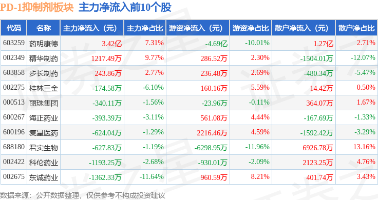 从资金流向上来看,当日PD-1抑制剂板块主力资金净流入7715.81万元,游资资金净流出7.52亿元,散户资金净流入6.75亿元。PD-1抑制剂板块个股资金流向见下表: