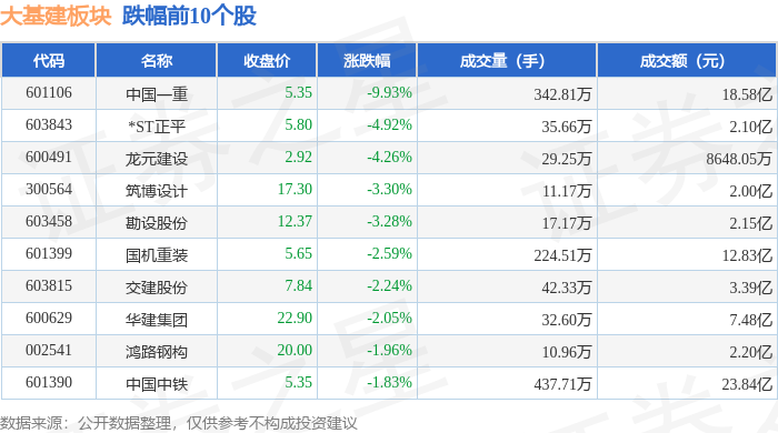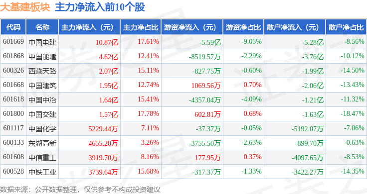 从资金流向上来看,当日大基建板块主力资金净流入13.11亿元,游资资金净流入1278.61万元,散户资金净流出13.24亿元。大基建板块个股资金流向见下表: