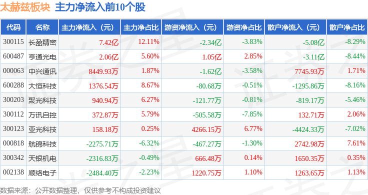 从资金流向上来看,当日太赫兹板块主力资金净流出10.95亿元,游资资金净流入4.48亿元,散户资金净流入6.48亿元。太赫兹板块个股资金流向见下表: