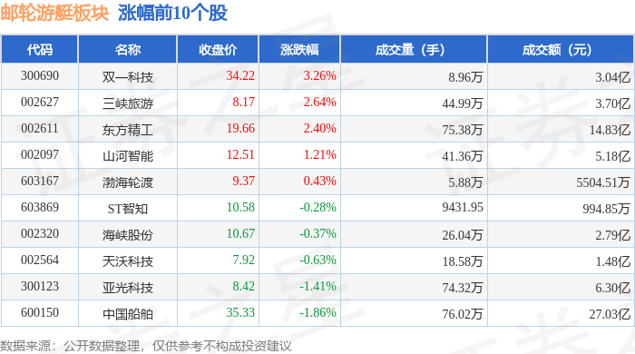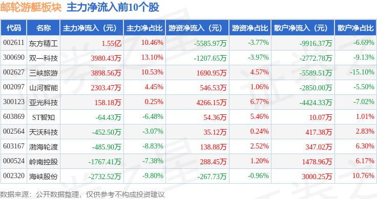 从资金流向上来看,当日邮轮游艇板块主力资金净流出4.96亿元,游资资金净流入1.99亿元,散户资金净流入2.98亿元。邮轮游艇板块个股资金流向见下表: