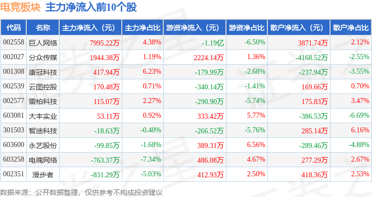 从资金流向上来看,当日电竞板块主力资金净流出27.77亿元,游资资金净流入4.1亿元,散户资金净流入23.67亿元。电竞板块个股资金流向见下表: