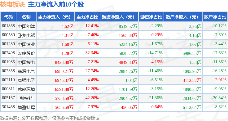 从资金流向上来看,当日核电板块主力资金净流出61.62亿元,游资资金净流入14.49亿元,散户资金净流入47.14亿元。核电板块个股资金流向见下表: