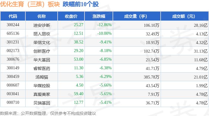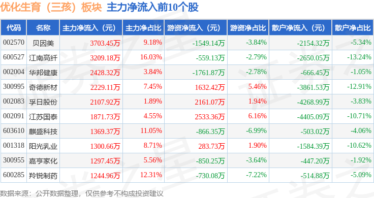 从资金流向上来看,当日优化生育(三孩)板块主力资金净流出27.37亿元,游资资金净流入2.85亿元,散户资金净流入24.52亿元。优化生育(三孩)板块个股资金流向见下表: