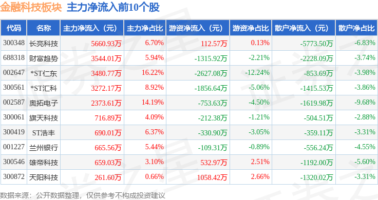 从资金流向上来看,当日金融科技板块主力资金净流出97.76亿元,游资资金净流入13.25亿元,散户资金净流入84.52亿元。金融科技板块个股资金流向见下表: