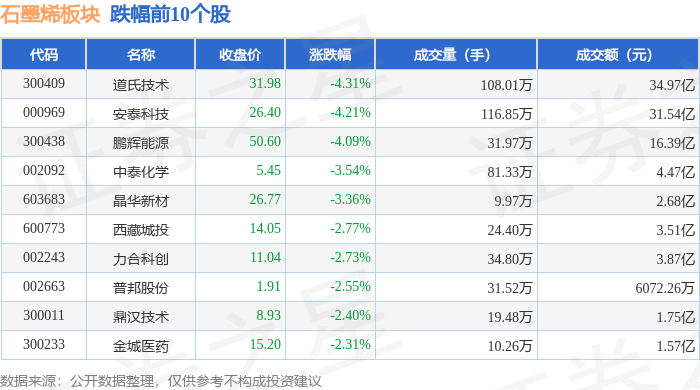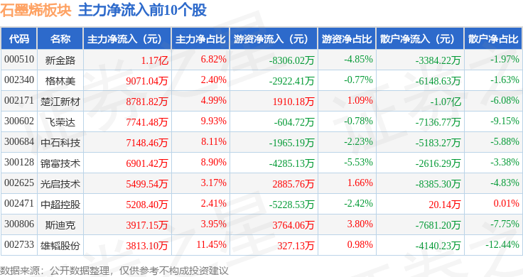 从资金流向上来看,当日石墨烯板块主力资金净流出11.5亿元,游资资金净流入1.3亿元,散户资金净流入10.2亿元。石墨烯板块个股资金流向见下表: