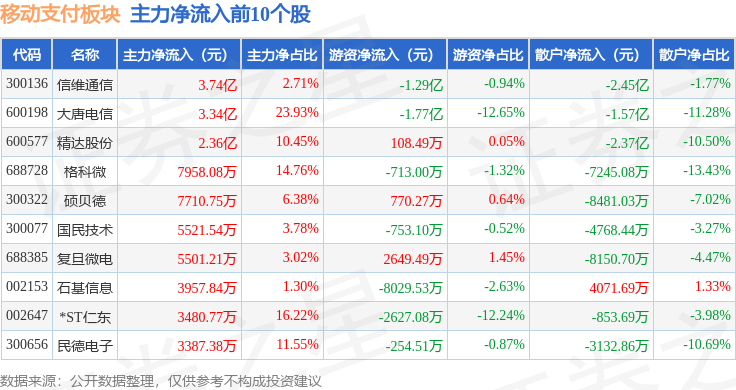 从资金流向上来看,当日移动支付板块主力资金净流出37.22亿元,游资资金净流入8.32亿元,散户资金净流入28.89亿元。移动支付板块个股资金流向见下表: