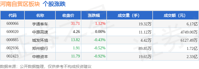 证券之星消息,1月16日河南自贸区板块较上一交易日上涨0.32%,宇通客车领涨。当日上证指数报收于4101.91,下跌0.26%。深证成指报收于14281.08,下跌0.18%。河南自贸区板块个股涨跌见下表: