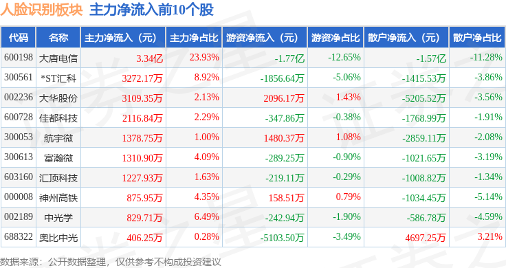 从资金流向上来看,当日人脸识别板块主力资金净流出13.69亿元,游资资金净流出1.62亿元,散户资金净流入15.3亿元。人脸识别板块个股资金流向见下表:
