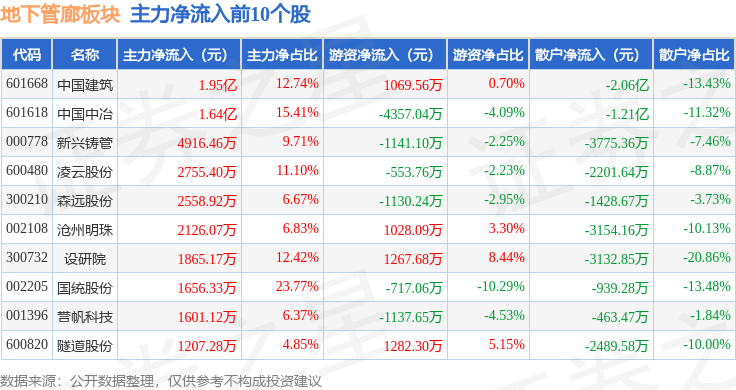 从资金流向上来看,当日地下管廊板块主力资金净流出1.14亿元,游资资金净流入3.03亿元,散户资金净流出1.89亿元。地下管廊板块个股资金流向见下表: