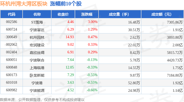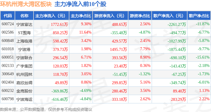 从资金流向上来看,当日环杭州湾大湾区板块主力资金净流出2.97亿元,游资资金净流入2.16亿元,散户资金净流入8140.66万元。环杭州湾大湾区板块个股资金流向见下表: