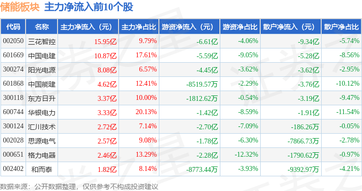 从资金流向上来看,当日储能板块主力资金净流出48.84亿元,游资资金净流入5.98亿元,散户资金净流入42.86亿元。储能板块个股资金流向见下表: