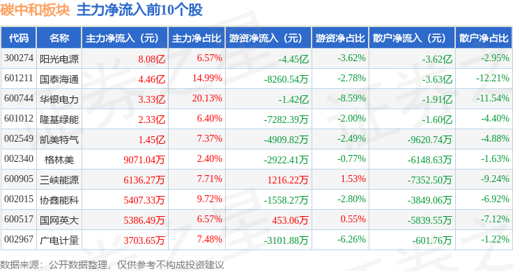 从资金流向上来看,当日碳中和板块主力资金净流入4.03亿元,游资资金净流出4.06亿元,散户资金净流入300.32万元。碳中和板块个股资金流向见下表: