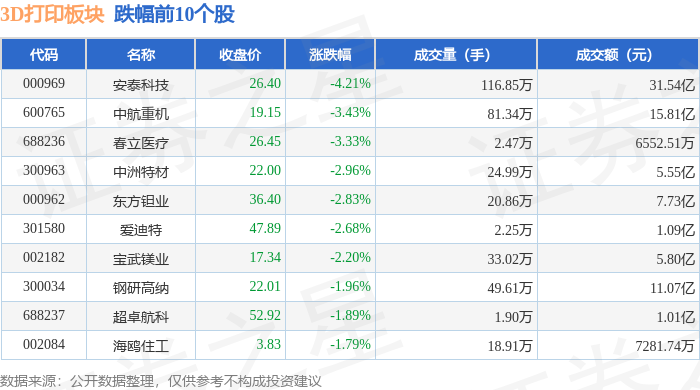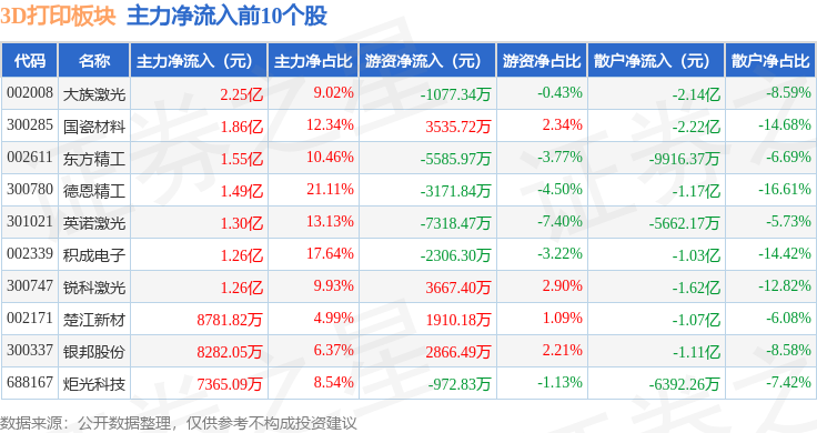从资金流向上来看,当日3D打印板块主力资金净流入6.46亿元,游资资金净流出1809.65万元,散户资金净流出6.28亿元。3D打印板块个股资金流向见下表: