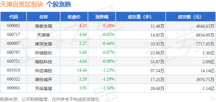 证券之星消息,1月16日天津自贸区板块较上一交易日下跌1.13%,天保基建领跌。当日上证指数报收于4101.91,下跌0.26%。深证成指报收于14281.08,下跌0.18%。天津自贸区板块个股涨跌见下表: