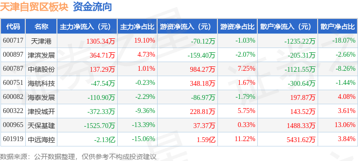 从资金流向上来看,当日天津自贸区板块主力资金净流出2.15亿元,游资资金净流入1.71亿元,散户资金净流入4398.62万元。天津自贸区板块个股资金流向见下表: