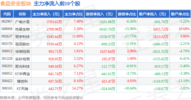 从资金流向上来看,当日食品安全板块主力资金净流出6.82亿元,游资资金净流入2904.39万元,散户资金净流入6.52亿元。食品安全板块个股资金流向见下表:
