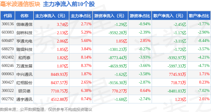 从资金流向上来看,当日毫米波通信板块主力资金净流入2.27亿元,游资资金净流出1.33亿元,散户资金净流出9326.17万元。毫米波通信板块个股资金流向见下表: