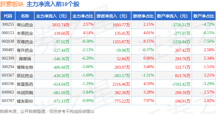 从资金流向上来看,当日肝素板块主力资金净流出1.24亿元,游资资金净流入1.17亿元,散户资金净流入679.41万元。肝素板块个股资金流向见下表: