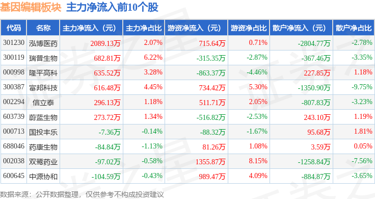从资金流向上来看,当日基因编辑板块主力资金净流出6.61亿元,游资资金净流入2.22亿元,散户资金净流入4.39亿元。基因编辑板块个股资金流向见下表: