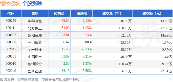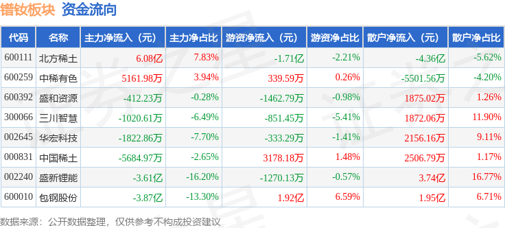 从资金流向上来看,当日镨钕板块主力资金净流出1.79亿元,游资资金净流入1645.42万元,散户资金净流入1.62亿元。镨钕板块个股资金流向见下表:
