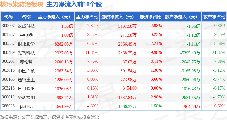 从资金流向上来看,当日核污染防治板块主力资金净流出3.99亿元,游资资金净流入1740.59万元,散户资金净流入3.81亿元。核污染防治板块个股资金流向见下表: