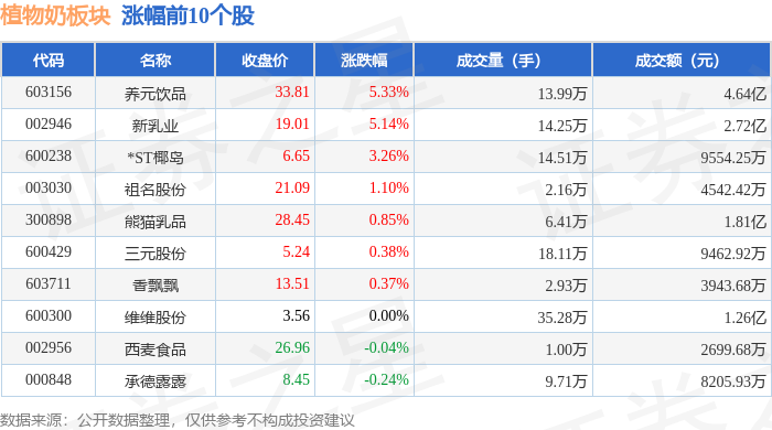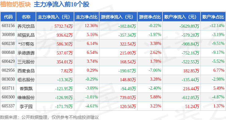 从资金流向上来看,当日植物奶板块主力资金净流出1.77亿元,游资资金净流入8944.29万元,散户资金净流入8746.2万元。植物奶板块个股资金流向见下表: