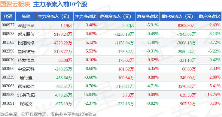 从资金流向上来看,当日国资云板块主力资金净流出26.84亿元,游资资金净流入1.38亿元,散户资金净流入25.46亿元。国资云板块个股资金流向见下表: