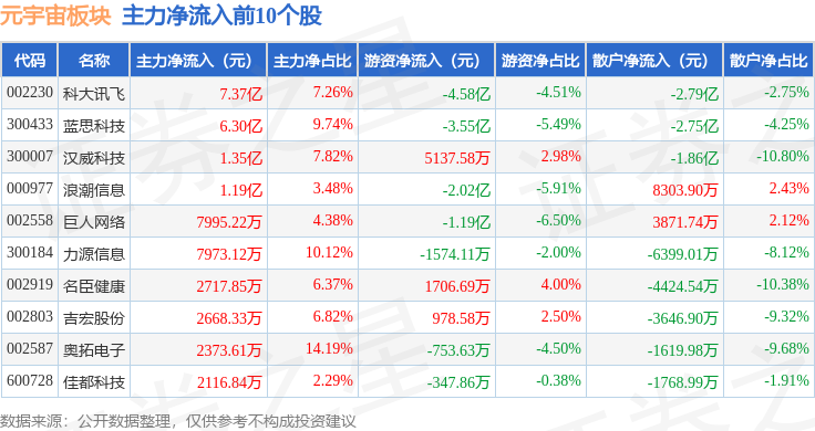 从资金流向上来看,当日元宇宙板块主力资金净流出96.65亿元,游资资金净流入5.81亿元,散户资金净流入90.85亿元。元宇宙板块个股资金流向见下表: