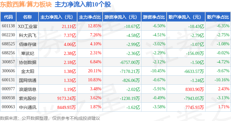 从资金流向上来看,当日东数西算/算力板块主力资金净流出83.77亿元,游资资金净流入1.77亿元,散户资金净流入82.0亿元。东数西算/算力板块个股资金流向见下表: